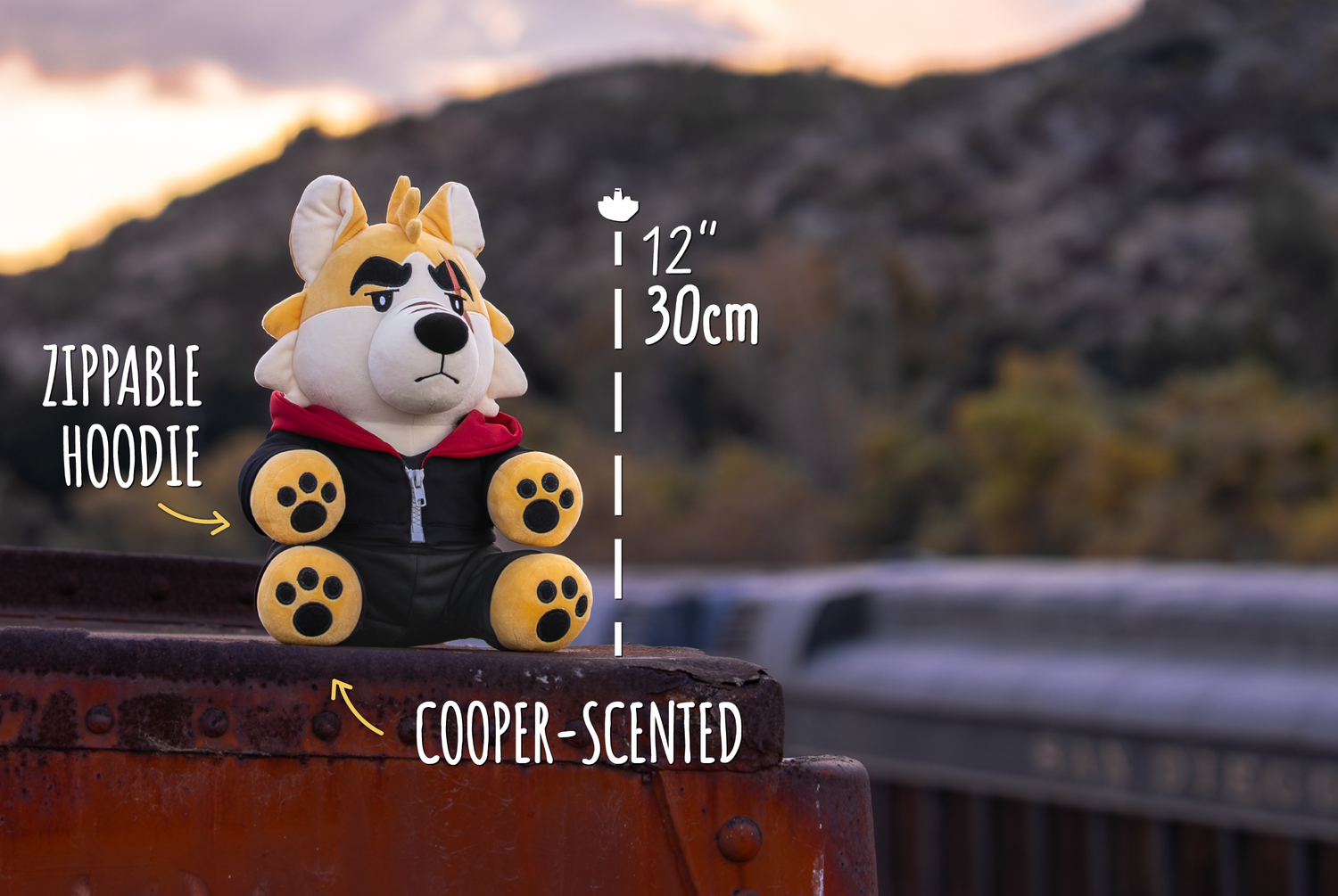 The Cooper Plush is ~12” tall, with designs by @BennyCartoonist, and illustration by @graysheartart.